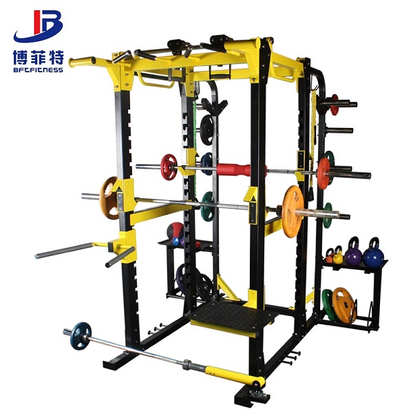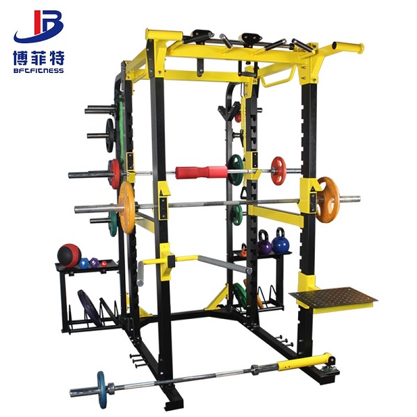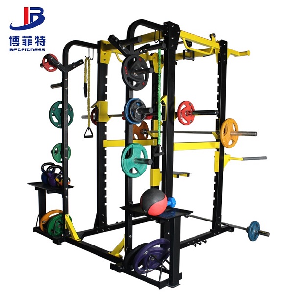 商用健身房大型深蹲架,专业多功能深蹲卧推综合抖奶黄色短视频APP,组合抖奶小视频在线观看APP下载批发直销,模块化功能可定制,两侧有杠铃片架和置物托盘,可进行深蹲、卧推、T杠划船、双杠臂屈伸、跳板、引体向上等训练